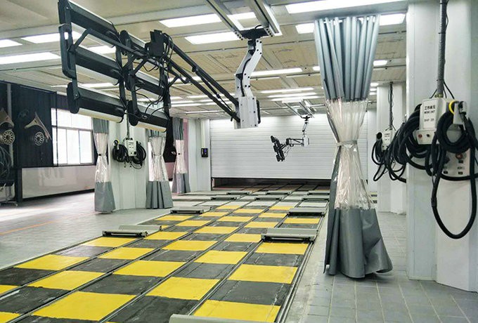 4、車輛進(jìn)出打磨、噴烤漆房的方式為:平板輸送鏈,確保車輛在工位間左右移動(dòng)。設(shè)回車軌道。